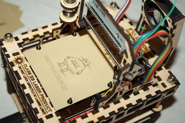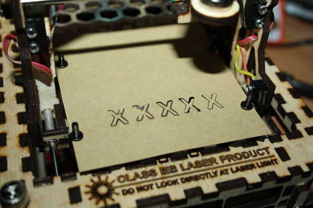 La primera vez no había nada allí, pero se un par de vueltas de la lente logré conseguir una marca en un papel. Después de que todo lo que necesitaba era un poco de puesta a punto y el láser estaba centrado correctamente en la mesa de corte.