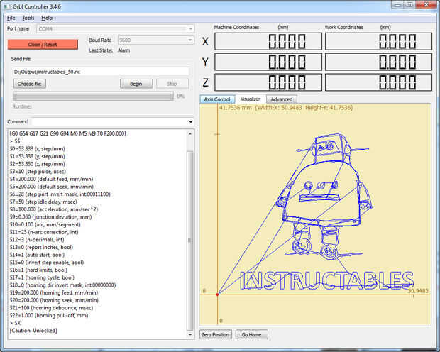 #define HOMING_SEARCH_CYCLE_0 (1 < 6 | Busque el código siguiente #define HOMING_LOCATE_CYCLE ((1< 7 | Reemplace el código con #define HOMING_LOCATE_CYCLE ((1< 6 | Guardar 7 | Vuelva a compilar el archivo grbl.hex. Usé mi Frambuesa Pi para recompilar el hex. En caso de que las cosas van mal he incluido el archivo hex modificado para usted a continuación. Usted necesitará flash tu Arduino con el nuevo hex. Si todo ha funcionado, y todos los ajustes se configuran correctamente usted debe ser capaz de ejecutar el ciclo de recalada ($H) y ver el MicroSlice cero sí mismo y estará listo para crear!