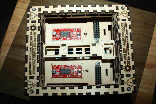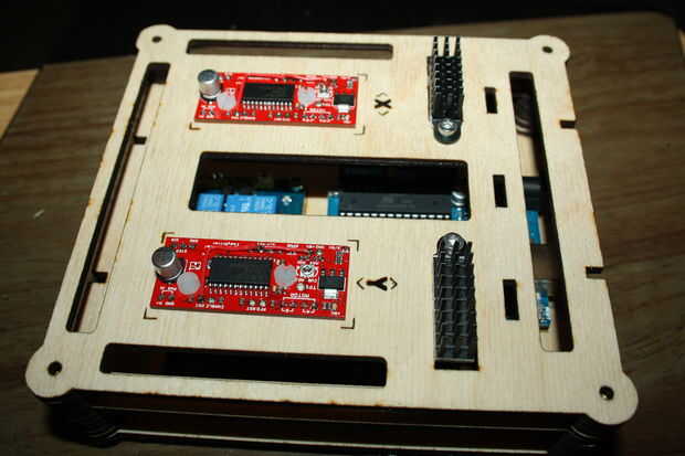 En la parte inferior la placa va el Arduino y los relés de doble ventilador y láser. En la placa superior se encuentra un LDO 5v para alimentar el ventilador y un 3,3 v LDO para conducir el laser. Delante de los LDOs son dos controladores de motores de EasyDriver, se logran los motores paso a paso.