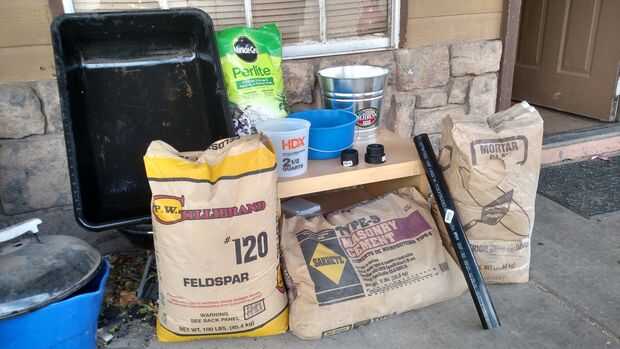 carbón vegetal (combustible de la fragua), arena de juego (cosas del bastidor), espuma de poliestireno (material de bastidor), Hi-temp paste capa dentro de la fragua.