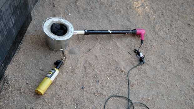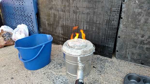 empezar a una temperatura muy baja por la quema de una pequeña cantidad de carbón añadiendo más cada cierto tiempo para mantener el fuego ardiente que queremos mantenerlo de cocción agregar más carbón y encender el ventilador y de seguir añadiendo carbón para llenar la cámara. una vez que los carbones han disminuido relleno y apague el soplador a hi a través de este tiempo usted debe ser capaz de oler el cemento más húmedo en el aire.