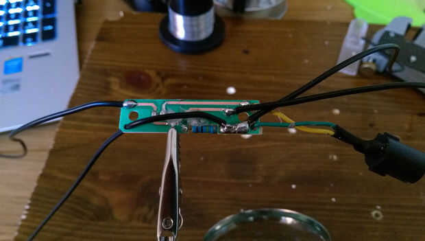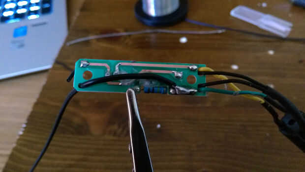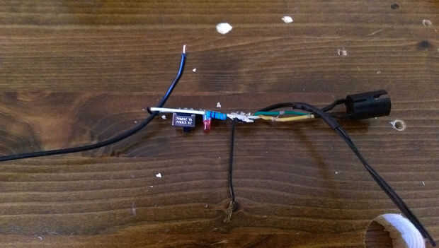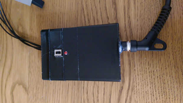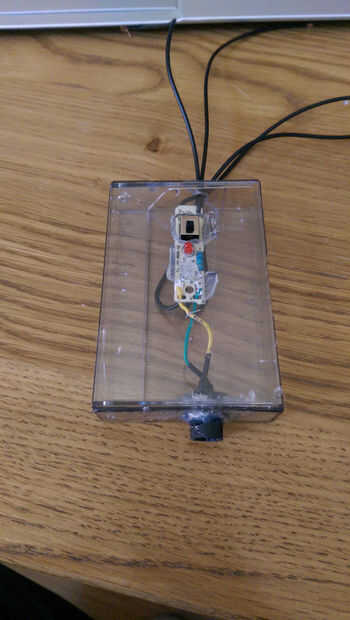 Una vez que el PCB y el adaptador de corriente se pegan, y el pegamento se haya enfriado, puede alimentar el nuevo cableado a través del extremo opuesto. Este da un cuadro de control completo, una vez que pones la caja de vuelta juntos, usted puede hacer la caja mirar un poco más atractivo dándole un abrigo apretado en cinta negra. Tenga cuidado para asegurarse de que no cubra su interruptor y LED.