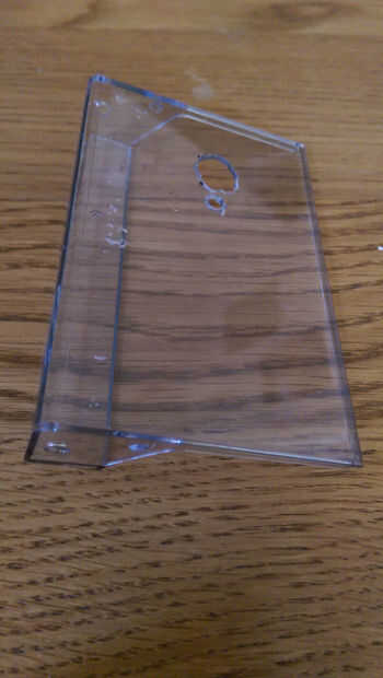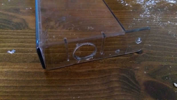 Usando un taladro, hacer los agujeros en la cara y los lados de la caja de cassette. Usando mi ejemplo, es necesario un agujero para el interruptor, el LED, el cableado nuevo (arriba) y la energía (parte inferior). Broca lentamente para evitar fracturar el caso. Alternativa podría derretir los orificios necesarios usando un soldador caliente, sin embargo ten en cuenta que fundir plástico puede por imprevisible, puede escupir y también creará tóxicos humos, así que hacer este paso fuera. Puede también dañar su soldador, use un repuesto Si decides ir a esta ruta.