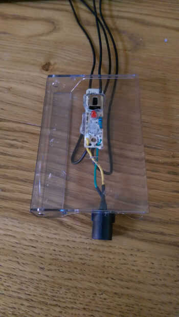 Una vez que usted tiene tamaño y perforado su cassette caja, puede instalar el PCB y el cableado interior. Utilicé una pistola de pegamento caliente para fijar esto. Tenga cuidado de no aplicar el pegamento en cualquier lugar no es necesario, o que interfiera con la función del circuito. Con el poder, puede que necesite pegar dentro y fuera del caso de cassette, para crear un buen sello.