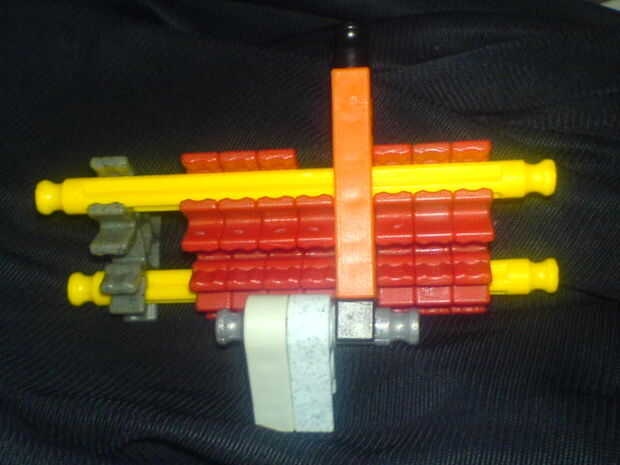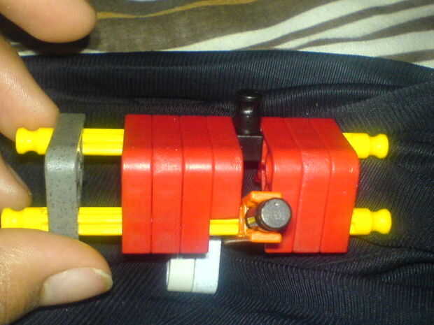 Conseguir sus dos barras amarillas. Añadir un conector rojo entre las dos varillas. Añadir dos conectores rojo más. conseguir el conector naranja y añadir una pieza de conector/rod a un extremo y la barra verde/negro a la other.gather la barra blanca y gris y 2 conectores gris luz. Añadir los dos conectores gris a la varilla del blanco/gris. Añadir 5 más conectores rojo. Y ME OLVIDÉ DE MENCIONAR ESTO. AGREGAR OTRA BARRA/CONNECOTR PIEZA NEGRO PARALELO A DONDE ESTÁ EL BLOQUE DE COSITA. Si esto no fuera suficientemente claro, necesita un cerebro nuevo