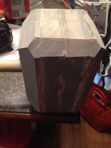 Después de muchas variantes, este es mi final Thor Hammer. Es un rápido vistazo a cómo lo hice.Paso 1: Hacer la cabeza Usé un poste y una pieza extra de madera que tenía en el garaje para formar la cabeza. Después del corte y encolado de juntas, que