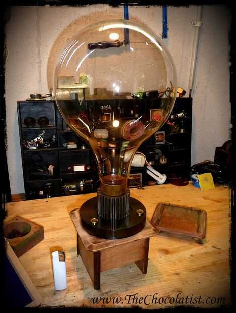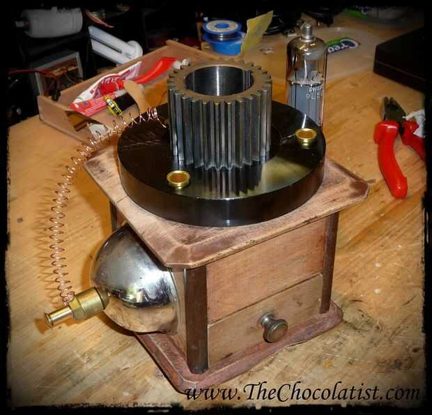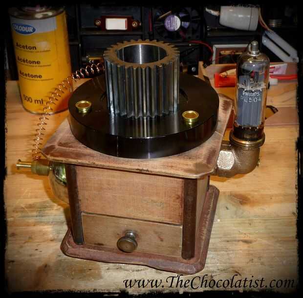 Ahora jodidos en la base con el engranaje de acero con tornillos de bronce enorme. La brillante cúpula de metal del molinillo de café, que coloqué en el lado ahora como una decoración agradable, junto con un cable de cobre que va en la parte superior.