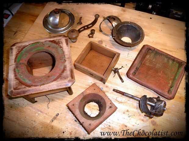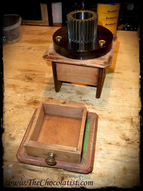 En las fotos puedes ver muy detallado cómo me la pelaron el molino. Todas las partes metálicas de la amoladora he quitado y había guardado la caja de madera. El cajón pegué a la parte inferior, para que pueda abrir el molino ahora levantando apenas el caso superior.