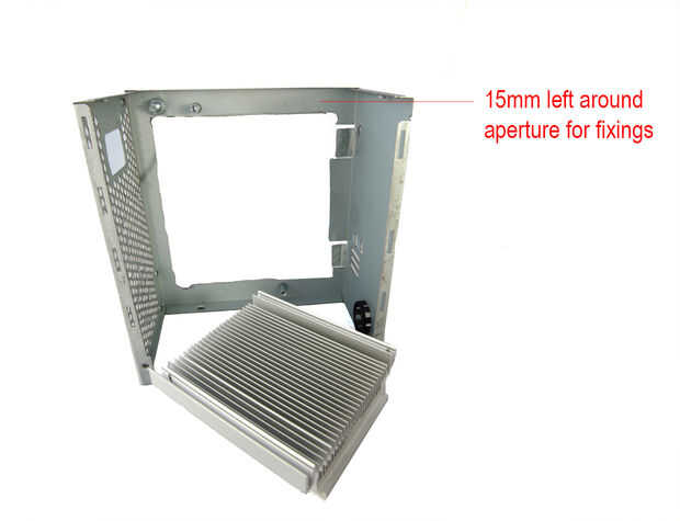 Nota: creo necesario dejar suficiente espacio para fijaciones de la placa de aluminio así que salí un 15mm rodean para la apertura estaba creando. TAMBIÉN TENÍA QUE COMPROBAR QUE EL DISIPADOR DE CALOR TAMBIÉN ENCAJARÍA A TRAVÉS DEL ORIFICIO FÁCILMENTE S SE MONTARÍA EN LA PARTE POSTERIOR DE LA PLACA DE ALUMINIO QUE SE FIJA SOBRE EL AGUJERO.