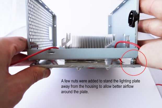 1. en primer lugar agujeros perforados en la placa de aluminio y la carcasa, por lo que podría empujar a través de 4 tornillos de máquina de x m4 y montar la carcasa a la placa de iluminación. He añadido un par de tuercas extras entre la placa con la luz y la fuente de alimentación de la vivienda con el fin de aumentar el flujo de aire alrededor de los bordes de la placa y conseguir debajo del disipador de calor un poco más.
