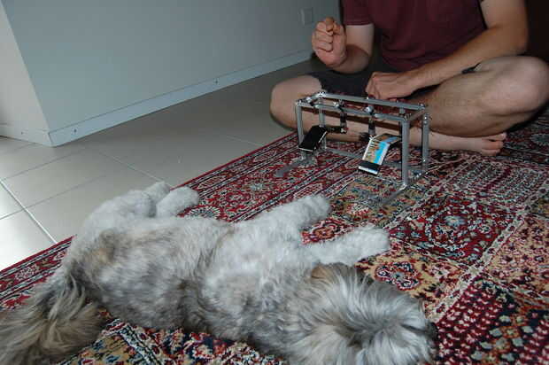 El perro tiene que ser muy cómodo todo el juguete para que tenga éxito. En la etapa antes de cualquier electrónica incluso Henry la cena encima y por debajo y alrededor de las vigas para un par de noches.