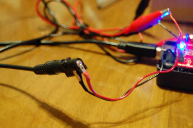 Porque el motor tiene 12 V para ponerse en marcha, los 5 V potencia de la placa Arduino no es suficiente, así que suave alambré un clavijero para el arduMoto aquí para conectar a una verruga de la pared de 12V.