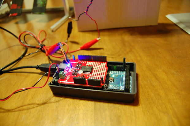 En la imagen puede ver el escudo ArduMoto en acción sobre el Arduino Mega 2560 en caso de un pequeño proyecto. La caja de plástico en la parte inferior es absolutamente necesaria si se trabaja con el escudo de Ardumoto, porque el motor puede estar fácilmente en corto circuito tocando los pines expuestos en la parte inferior de la arduino.