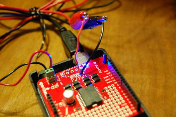 Se puede ver que la Junta Ardumoto tiene unos LEDs de estado que parpadean en un cambio en la dirección o mediante el envío de una señal de pulso modulada a través de la potencia de salida.