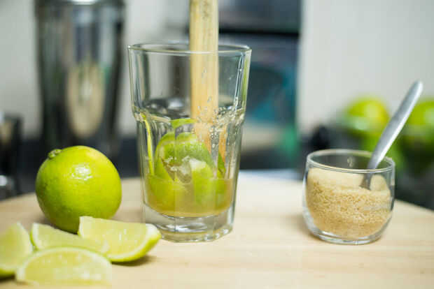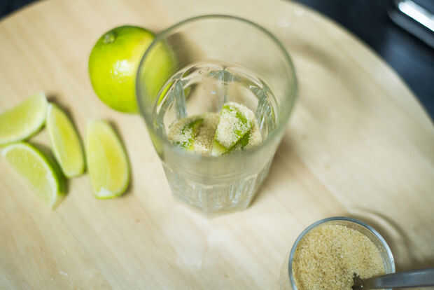 Añadir tus rodajas de limón y caña de azúcar a un vaso. Utilizando un mortero de madera o un utensilio de madera machacar un les. Trate de no rotar el muddler, sólo pulse, para que usted no contusión de la piel de limones, que es amarga.