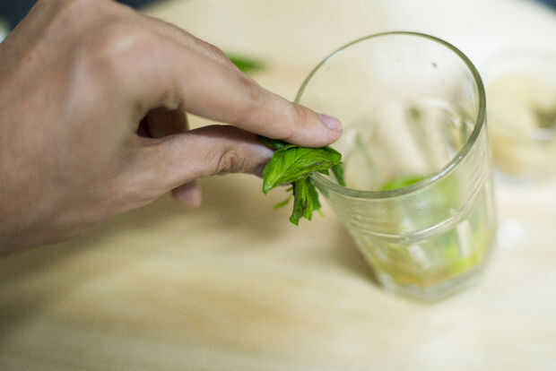 Tomar las hojas de menta en tus manos. Aplaudir sus manos para contusión de las hojas, que se suelte sus aceites y aromas. Frotar el borde del vaso con las hojas, para que cuando te lo bebes, sientes un aroma sutil de la menta. Agregar.
