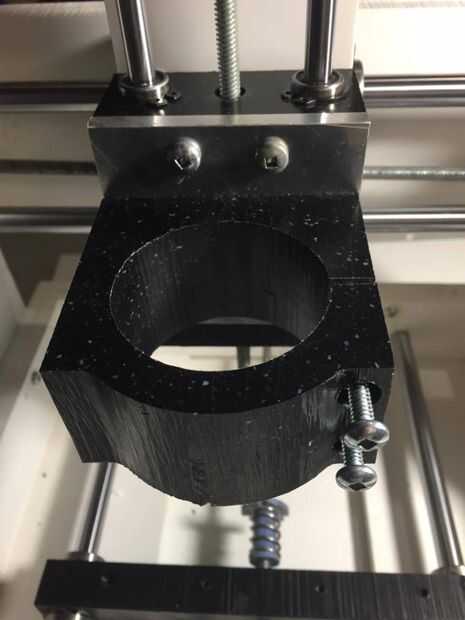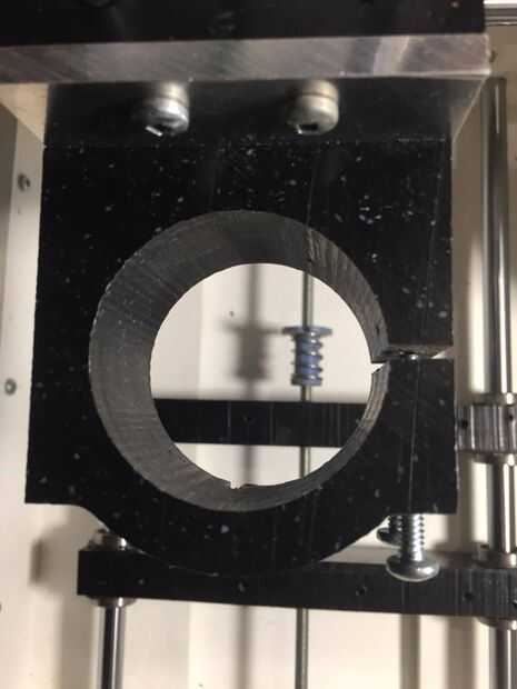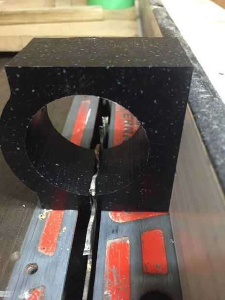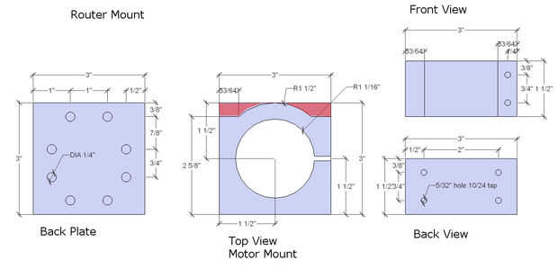 Corte y taladro de la placa de aluminio gruesa de ¼" a especificaciones técnicas en dibujo, o pueden utilizar plástico de polietileno de alta densidad. Cortar plástico UHMW en bloque de 3 "x 3" 1 ½" o lo que sea grueso se las arregló para recoger. Corte el centro del bloque con en mi caso un 2 1/8" agujero Sierra Verifique el diámetro de la herramienta giratoria. Retirar el exceso que he esbozado en rojo con una sierra de cinta. Conjunto de que la Sierra de mesa para hacer la muesca en el lado. Taladro grifo cuatro agujeros en la parte posterior, taladro y tap 2 agujeros en frente profundamente bastante para ir más allá de la brecha del lado. Perfore agujeros de 3/16" para permitir la remoción de apriete para la sujeción de la acción. Utilice 1" 10/24 tornillos para fijar a la placa de montaje y 2-1 ½" 10/24 tornillos para la sujeción de router.