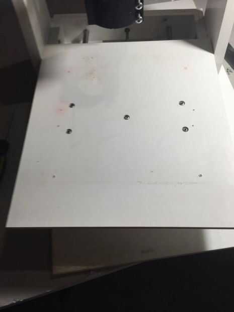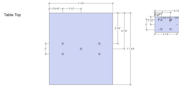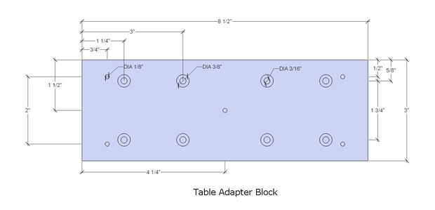 Se corta la placa de adaptador de mesa de 5/8" UHMW espesor después de cortar a tamaño Perfore orificios de 3/8" 3/16" de profundidad con una broca forstner y luego perfore 3/16 todo el camino a través de los agujeros y agujeros 1/8 para sujetar la tapa de tabla. Sujete el bloque para X bloques con tornillos de 1" #8 y fijar la mesa al bloque con tornillos de 1" #8. Tenía un pedazo rojo de 1/4' "ABS plástico 8 ¾" x 8 ¾" me centré en la tabla para una tabla de spoiler.