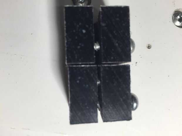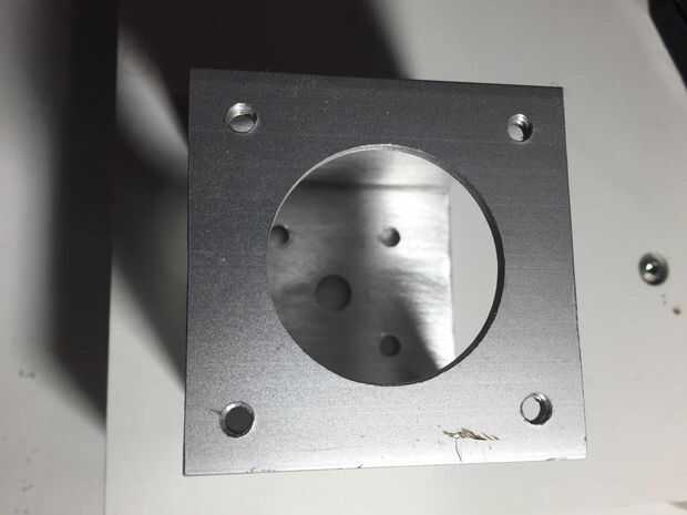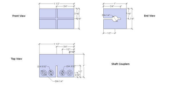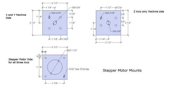Quién dice que los acopladores tienen que ser redondos. Cortar estos de plástico UHMW y perforado ¼" agujero en el centro para la varilla roscada la ranura vertical a una profundidad de ½" y la ranura horizontal a una profundidad de ¾" en la Sierra de mesa tenga cuidado aunque use una vara para empujar. Luego perforé el 1/4" Tornillo agujero aout un 1/8" para contrarrestar la cabeza y un orificio de 5/32" hasta la ranura y luego un agujero 3/32" derecho a través del fregadero. Si tienes sólo un eje de diverso tamaño, agrande el orificio medio. Para los soportes del motor que corte una 2 1/2" tubo 2 ½" para que cada montaje luego perforé un 1 ½" en el centro con un agujero de Sierra del diamante. Después nema 23 de poner en el agujero y marcan las ubicaciones de los tornillos y perforado y golpeado ligeramente les. Sujetan los soportes de la máquina con tornillos de 5/8" #8 y sujetar los motores a los montajes con tornillos ½' 10/24.