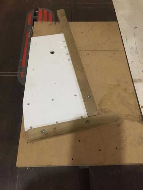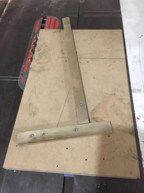Pila y taladrar 4 trozos dejando pedazos de izquierda y derecho alineados y taladro-9 3/16 "agujeros a través de todas las piezas excepto 2 en ángulo. Aquí es una plantilla simple que hice para ángulos de corte. Usted simplemente coloque una tira de madera que encaja en la ranura del calibrador de mitre en la parte posterior de algunos restos de madera lo suficientemente grande para acomodar la pieza de lado y pase a través de la Sierra de mesa. Entonces pone su pieza lateral con ubicaciones de ángulo alineados con el borde de la Junta y atornillar unos listones de madera para sostenerlo en lugar. Recorren todas las 4 piezas a la perfección.