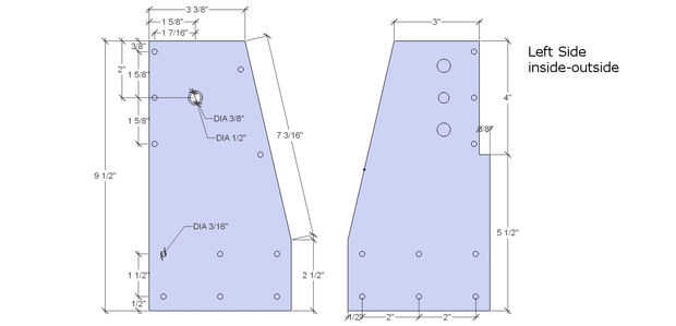 Corte 2 refuerzos a los tamaños indicados. Taladre los orificios de 3/16" a través de la pieza grande y 1/16" de los agujeros a una profundidad de unos ¼' en piezas más pequeñas. Mantenga el agujero de una pulgada a la izquierda. Utilice 1" #8 para ensamblar. Si usted usa panheads taladro guiones para la separación. Nuevo uso 1" #8 tornillos de los orificios del extremo usan 5/8" #8 para 2 orificios en ángulo y 8 en refuerzo.