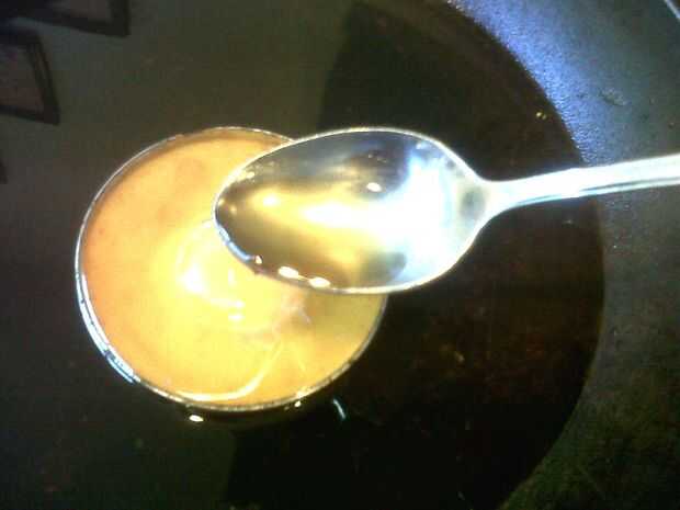 Con una cuchara llene del algunos de aceite en la sartén como se muestra en foto 1.