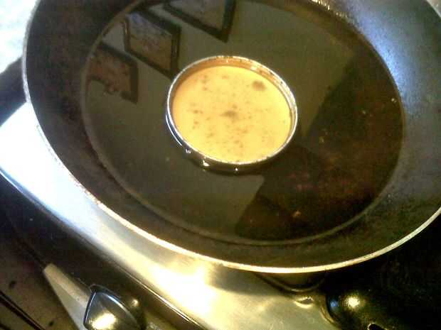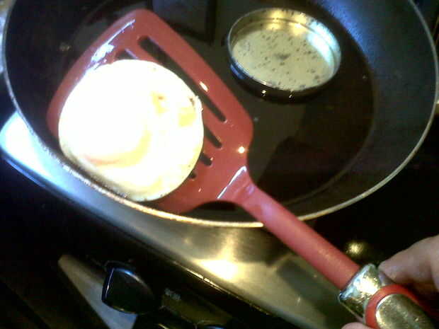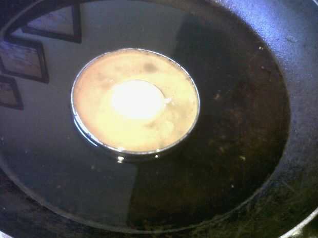 Si you´re usando una tapa de lata como yo, una vez que el huevo es de listos, asegúrese de it´s no adheridas a cualquier parte del molde manteniendo el molde con un par de pequeñas pinzas y colocar la cuchara en el huevo. Si usted puede girar el huevo dentro del molde, luego you´re bueno para ir.