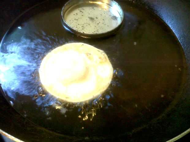 Freír el huevo (siempre a baja temperatura) y suavemente con una cuchara, vierta aceite sobre el huevo (huevo zona primero) hasta que el huevo esté cocido a tu gusto. (algunos como la yema de huevo completamente cocido, algunos medio y otros como él suave).