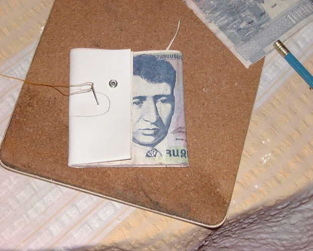 Abrir con cuidado la cartera dejando el hilo en su lugar.