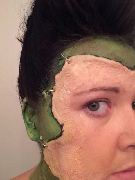 Utilizando alambre de bronce y algunos cortadores de alambre yo hace alrededor de 20 "grapas" que pegué en el látex / manchas de cera de la cicatriz alrededor de mi cara y luego con más látex líquido. Sugiero aplicar las grapas después de que has pintado todo, ya que tras aplicar puede manchar su trabajo.