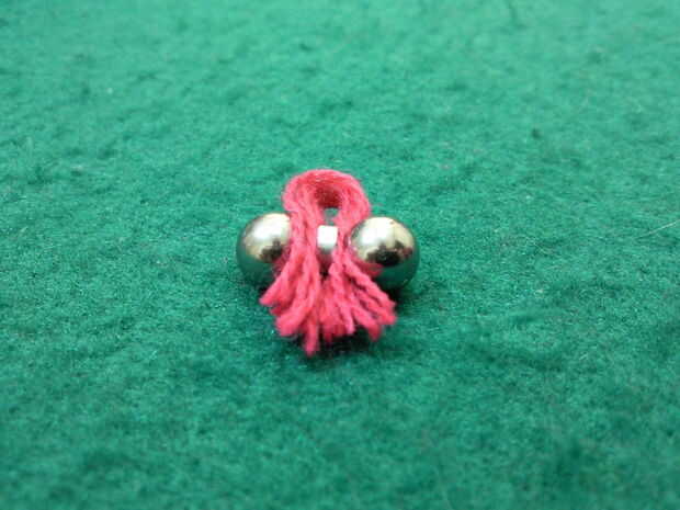Este es el camino que debes tomar los hilos en la bola de lana, entre un rodamiento y el imán y luego con el segundo cojinete. El imán debe ser fácilmente ocultado por los hilos de rosca.