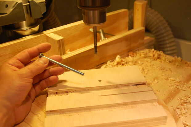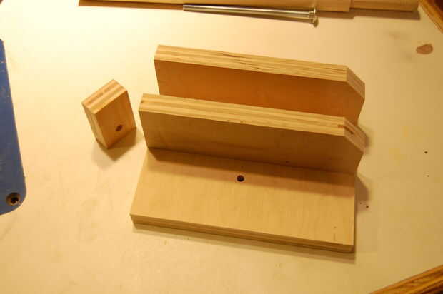 Por último, se corta un bloque separador para caber entre los rieles del soporte en el extremo cuadrado. un agujero de 5/16" es perforado 3/4" abajo de "top" y centrado en el entre las partes.