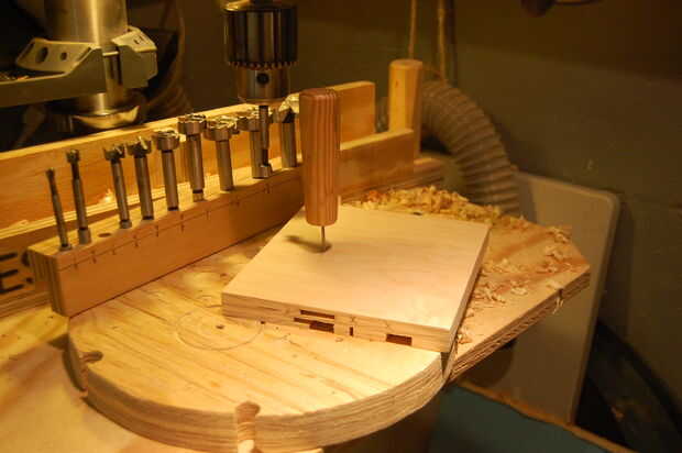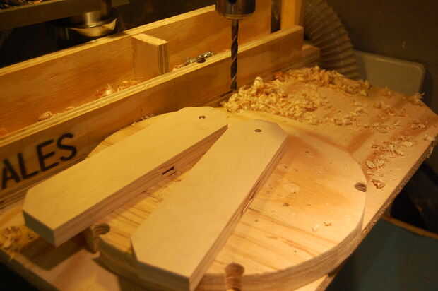 La base de montaje de la cámara está hecha de madera contrachapada, corte en la Sierra de mesa. Dos 3/4" mortajas, con una separación de 1 1/2", se cortan de centro en la parte inferior de esta placa. 3/4" de la ranura más central y centrado entre los otros dos lados se hace una marca para la ubicación de montaje de rosca de la cámara. Desde el lado superior del tablero, una pieza Forstner se utiliza para perforar un agujero lo suficientemente grande en el diámetro para una tuerca de seguridad y sólo lo suficientemente profundo como para que se sienta apenas debajo de la superficie. El agujero se perfora a través de entonces con un 1/4" bits.