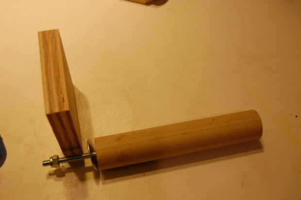 Para el montaje de rosca de la cámara, cortar la cabeza de un perno de 1/4-20 (varilla roscada es otra opción) y una tuerca de seguridad se utiliza para establecer la profundidad de inserción de la cámara. Evitará que me lo arranque apretado, pero también me hace cómodo colgar mi cámara del techo, porque sé que tengo una conexión sólida. El mango es una sección de 1 1/4" espiga con un agujero perforado por el centro para pegar en el perno, que se hace con epoxi.