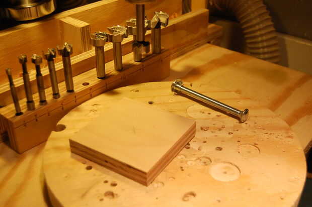 El punto central se encuentra en la placa base. Con una broca forstner, un agujero se perfora sólo amplia y lo suficientemente profunda como para empotrar la brida de una tuerca en T de 5/16". El agujero entonces se perfora a través con un 5/16" bits.