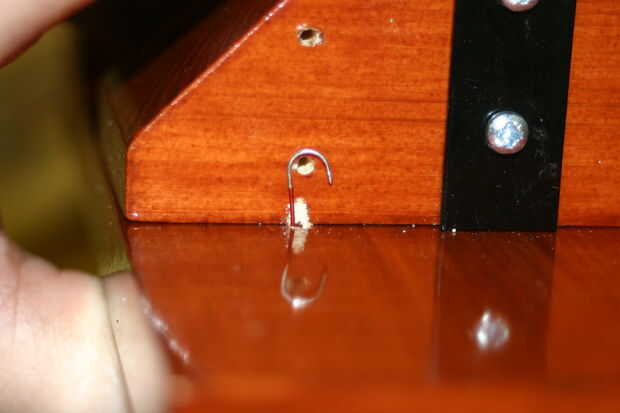 Mirando la vista lateral que se puede ver lo que estoy tratando de lograr, el taladro de 3,3 mm se ha puesto justo en el final de la tirada así tiene suficiente longitud para hacerlo a través de la madera.