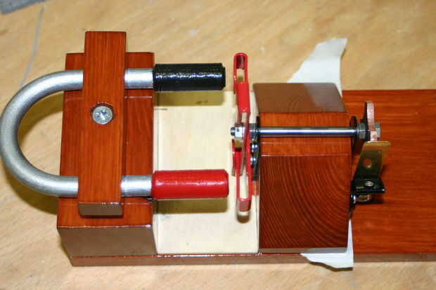 Ahora en el poco complicado montar el conjunto giratorio. He poner un poco de cinta adhesiva en la base debajo del conjunto y dispone de un espaciador entre el imán y el bloque giratorio, esto ayuda a mantener todo cuadrado, pero sólo funciona en el bloque del imán y el imán es ambos cuadrados. la distancia entre los dos bloques puede variar pero en mi caso es 51mm que hace que la brecha entre los polos del rotor y del imán de unos 3mm.