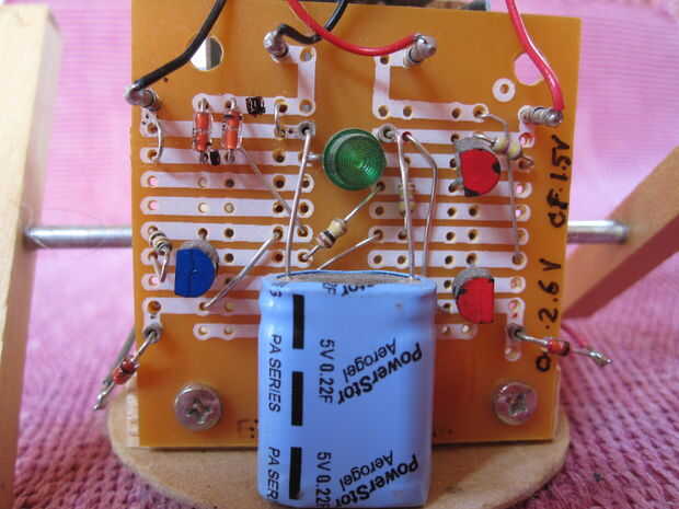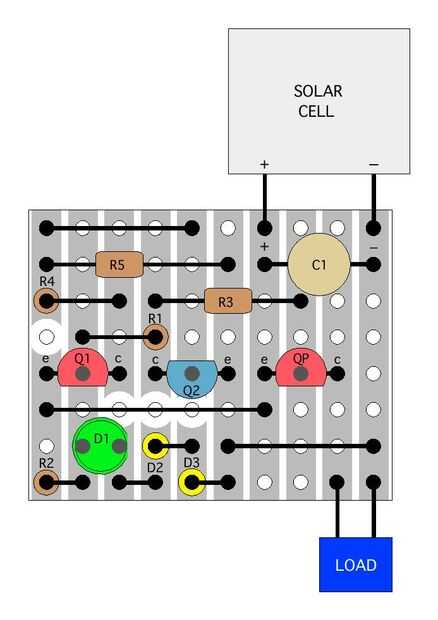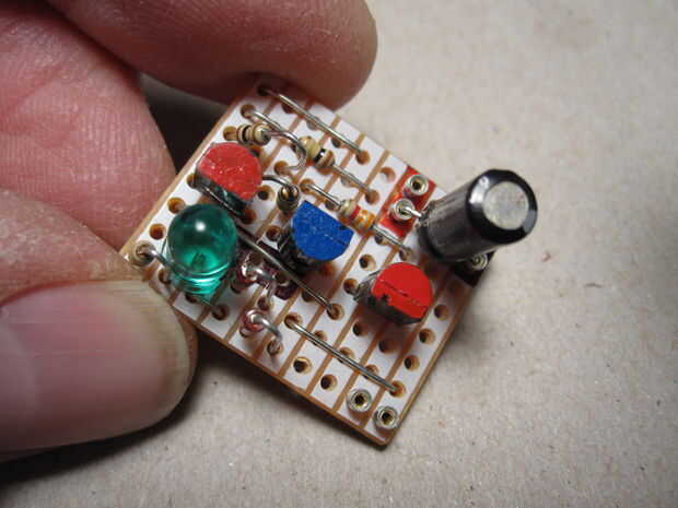 El circuito descrito aquí tiene un verde LED D1 y dos diodos D2 y D3 en la cadena de disparo para una tensión de encendido de aproximadamente 2.5V. Los diodos se colocan verticalmente con el extremo del cátodo hacia arriba, que es, orientado hacia la tira de negativos autobús en el borde derecho del tablero. Un diodo adicional se puede instalar fácilmente en lugar del puente muestra de D1 a D2 a tope hasta el punto de encendido.