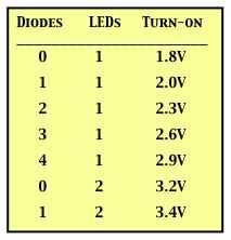 Los LEDs utilizados en la fabricación de las medidas de la mesa eran más rojos de baja intensidad. Más otro rojo nuevos LEDs que se han probado trabajan sobre el mismo, con tal vez una variación de sólo sobre más o menos 0.1V en su nivel de activación. Color tiene una influencia: un LED verde dio un nivel de disparo de aproximadamente 0,2 v mayor que una red comparable. Un LED blanco con no diodos en serie dio un punto de encendido de 2.8V. Intermitente LED no es apropiado para este circuito de motor.
