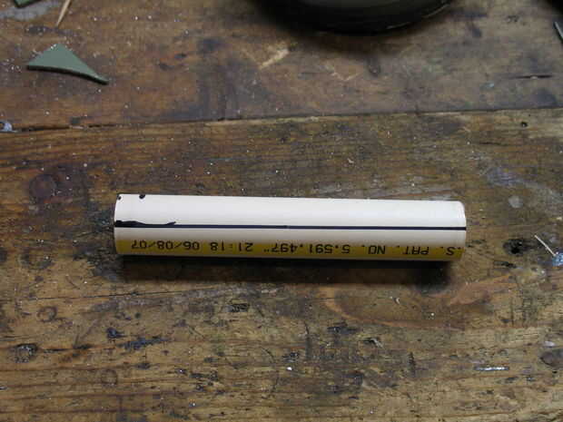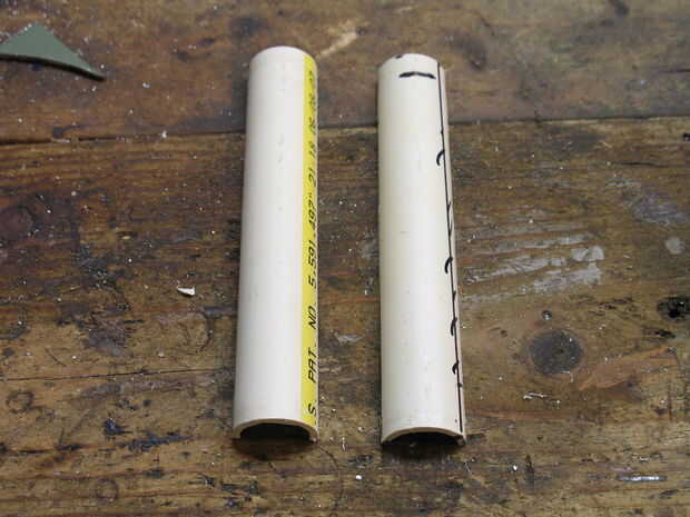 Llevar a cabo el PVC, marque y corte una sección de 5 pulgadas. Como se ve en el cuadro quinto, marque una línea a lo largo del segmento cortado. Esta es una guía que nos ayude a cortar recto. Una vez que el marcador se seque, cortar por la mitad!