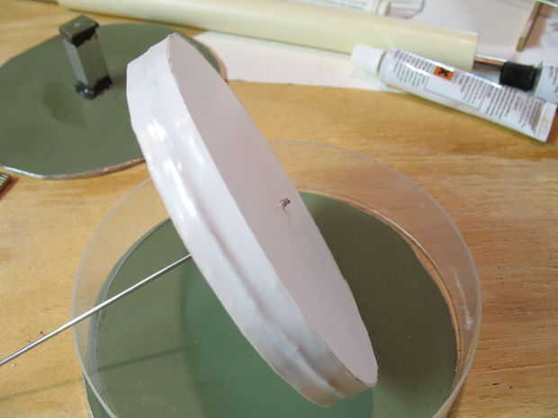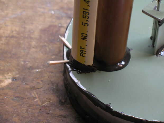 3 - empujar a través (o poke luego a través del taladro) el centro del displacer y epoxy. Asegúrese de que esté bien. Es un verdadero dolor en el trasero cuando se cae y has pegado todo junto... Sólo confía en mí en eso. ;)