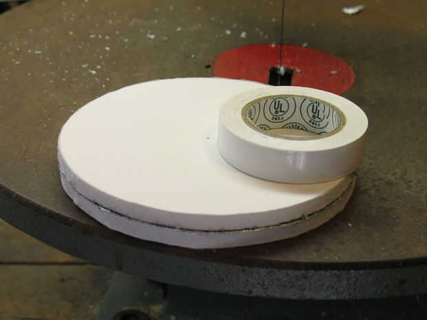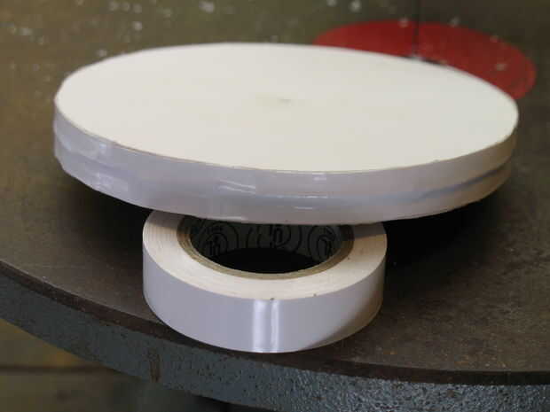 Apilar los dos círculos, luego, usando emparejar cinta aislante, cinta adhesiva alrededor de la circunferencia. Si quieres podría pegarlos juntos y no va a causar un problema.