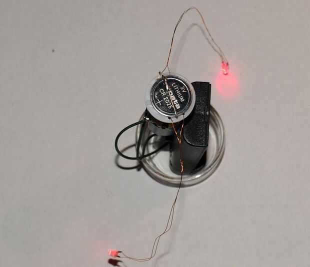 Por conectar dos pequeños leds conectados a un motor por medio de cables tienes dos anillos brillantes algo tambaleantes flotando en el aire. Ver el video en el ultimo paso.