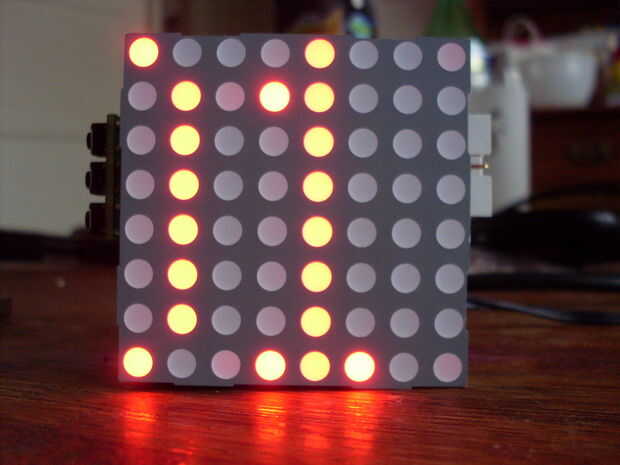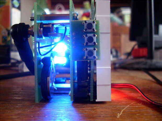 Puede ser alimentado por USB o clavija y tiene una luz de fondo tha lentamente cambia de rojo a azul y la espalda.