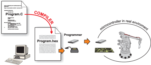 En primero tenemos que escribir el programa y transferir el programa del compilador a la memoria del microcontrolador. Compilador es un programa que proporciona un entorno para escribir, probar y depurar un programa para el microcontrolador. El programa para un microcontrolador generalmente está escrito en C o lenguaje ensamblador. Finalmente, el compilador genera un archivo hex que contiene la instrucción de lenguaje máquina entendible por un microcontrolador. Es el contenido de este archivo hexadecimal que se transfiere a la memoria del microcontrolador. Una vez que un programa es transferido o escrito en la memoria del microcontrolador, luego trabaja de acuerdo con el programa.