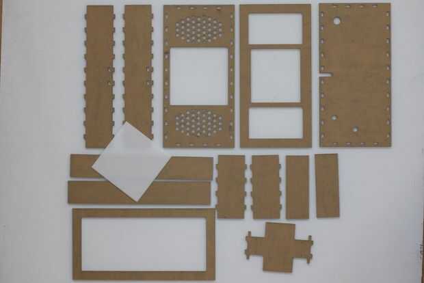 La carcasa de acrílico fue diseñada muy rápidamente, con el diseño de ficha-agujero que he perfeccionado en otros proyectos. Este estilo de carcasa tiene estructural 'esqueleto' así como una funda estética, por lo que no ves las pestañas de montaje en los agujeros. Utiliza un 1/32" blanco Semiopaco actuar como difusor de la matriz de LED. Pueden ser un poco demasiado brillantes a veces.