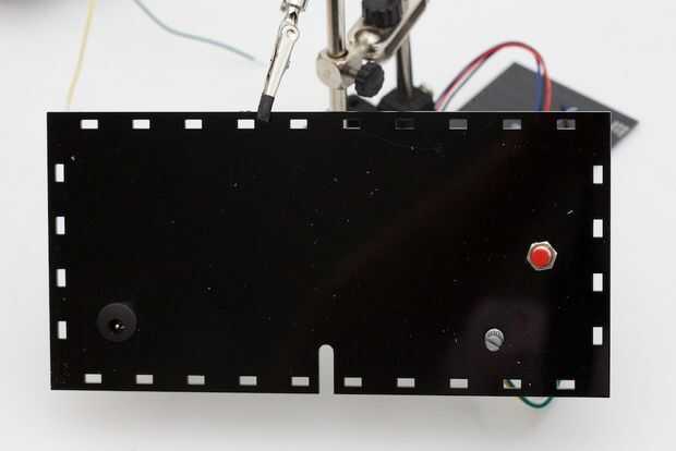 La ranura en la parte inferior es que el cable de audio pasar fuera de la caja. Pensé en cortar el cable y soldar directamente, evitando la ruptura TRRS, pero los cables dentro de los cables de audio son generalmente muy delgada y demasiado frágiles y problemáticos de la soldadura.