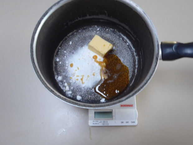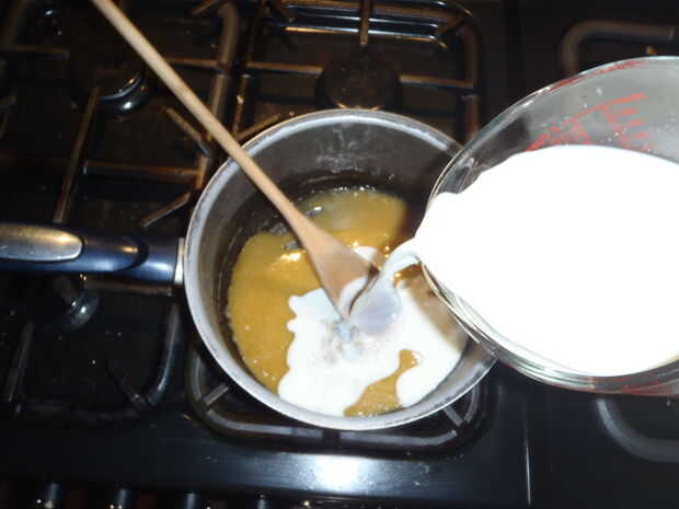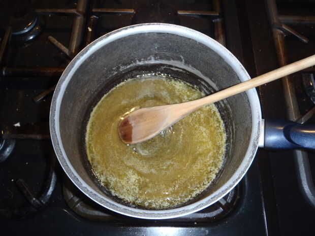 Poner a fuego lento en tu estufa. Seguir revolviendo hasta que se haya derretido la mantequilla y el azúcar se disuelva. Esto debe tomar unos 10 minutos. Cuando esto esté hecho, apaga la estufa.