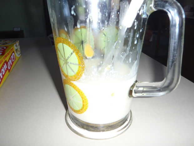 Añadir 100ml de leche (no importa cuánto, pero una pequeña cantidad). Ahora todo en la olla de transferencia en la jarra.