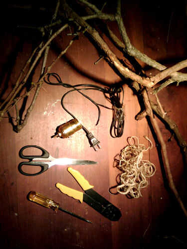 1. viñas - obviamente, necesita vides/ramitas para construir esta lámpara. Tiré de mina fuera de la cerca en mi patio trasero. No importa qué tipo de vid o ramita elegir realmente. Solo necesita ser flexible pero no endebles. Si usted no puede formar en al menos un medio círculo entonces usted no puede utilizarlo.